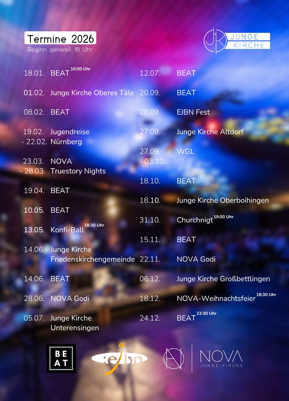 Auch 2026 gibt es wieder ein starkes Gottesdienst-Angebot für Junge Menschen in unserem Kirchenbezirk. Von uns in Neuffen und anderswo gestaltet wollen wir Junge Menschen einladen, mit uns zusammen Jesus zu feiern, uns nach ihm auszustrecken und in unserem Glauben zu wachsen. Herzliche Einladung!