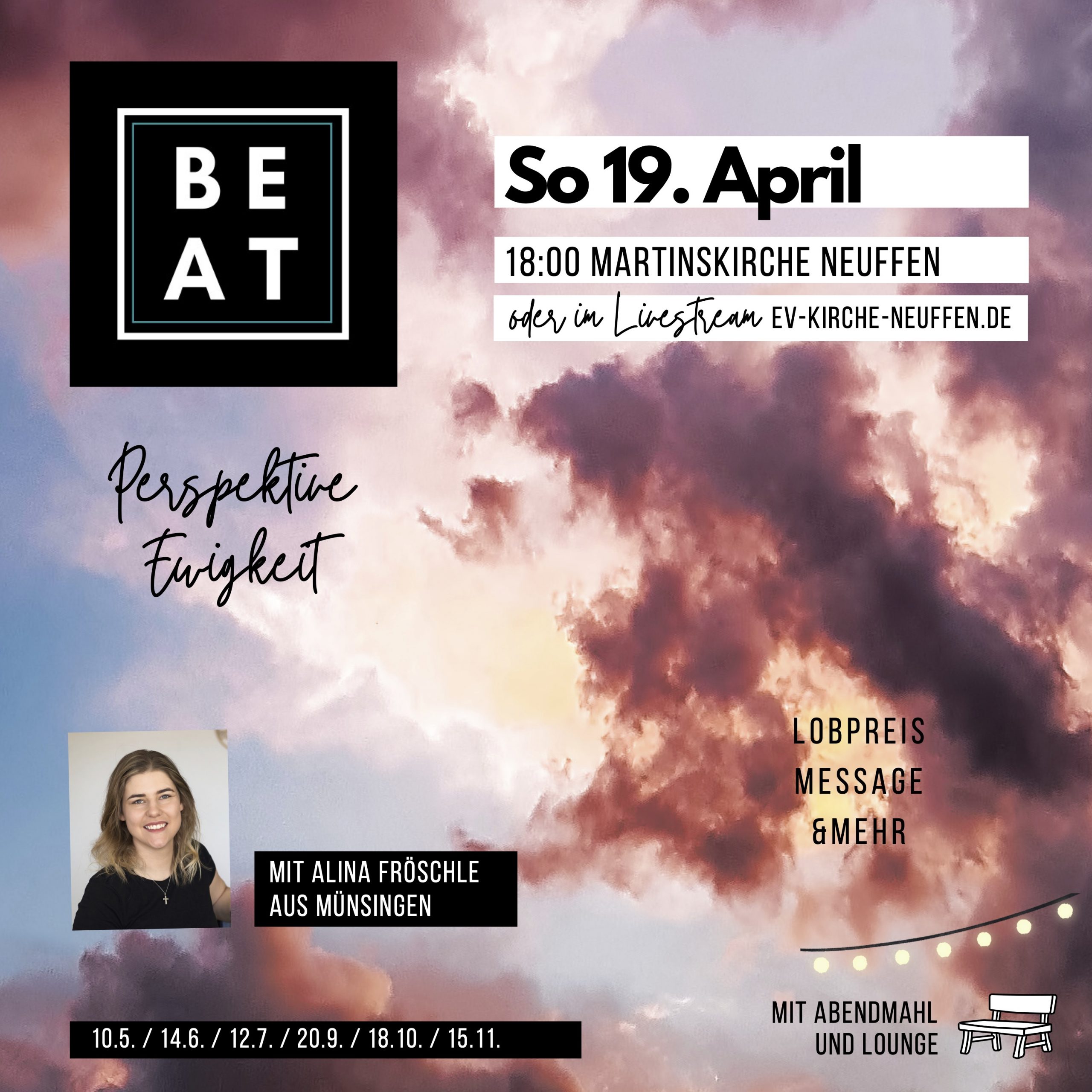 Wir laden euch herzlich zum nächsten BEAT ein: am 19. April um 18:00 zum Thema „Perspektive Ewigkeit“. Predigen wird Alina Fröschle, die uns mit rein nehmen wird, wie wir uns das vorstellen können. Untertitel könnte sein: „Himmel, Hölle, Hoffnung – Eine Bestandsaufnahme“ oder „Warum die Zukunft heute schon zählt“. Seid gespannt auf Bibelstellen und Gedanken dazu.