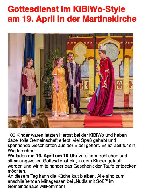 Außerdem gibt es wieder Lobpreis mit der Band und wir feiern zusammen mit den Konfis und ihren Familien das Abendmahl.